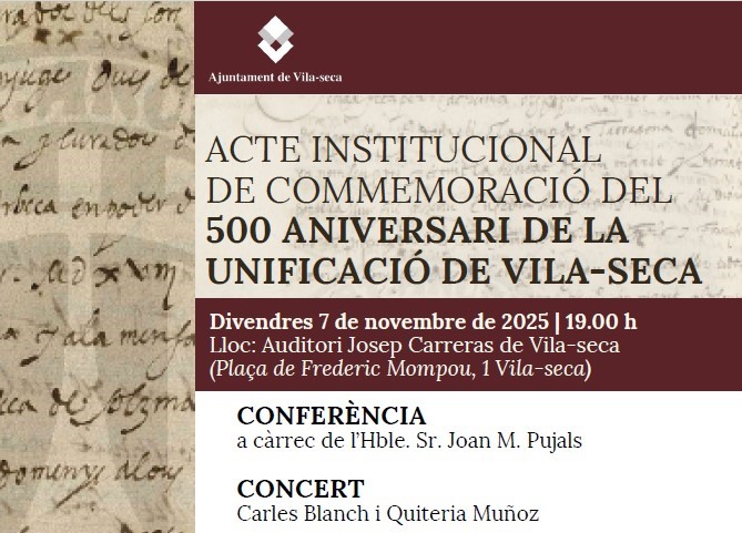 L’Ajuntament de Vila-seca celebrarà aquest divendres, dia 7 de novembre de 2025 a les 19.00 h, l’acte institucional de commemoració del 500 aniversari de la unificació de Vila-seca, que tindrà lloc a l’Auditori Josep Carreras.