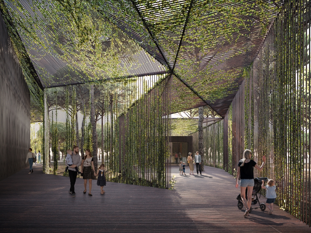El nou centre es dissenya com un conjunt de volums (que acullen les diferents funcions programàtiques), aixecats sobre una plataforma a 90 cm del sòl coberts per una envolvent perimetral i zenital que actua a manera d’umbracle vegetal. L’edifici completa la seva integració paisatgística amb la nova urbanització i la formació d’un hàbitat -recuperat- natural, de les pinedes típiques del litoral català.