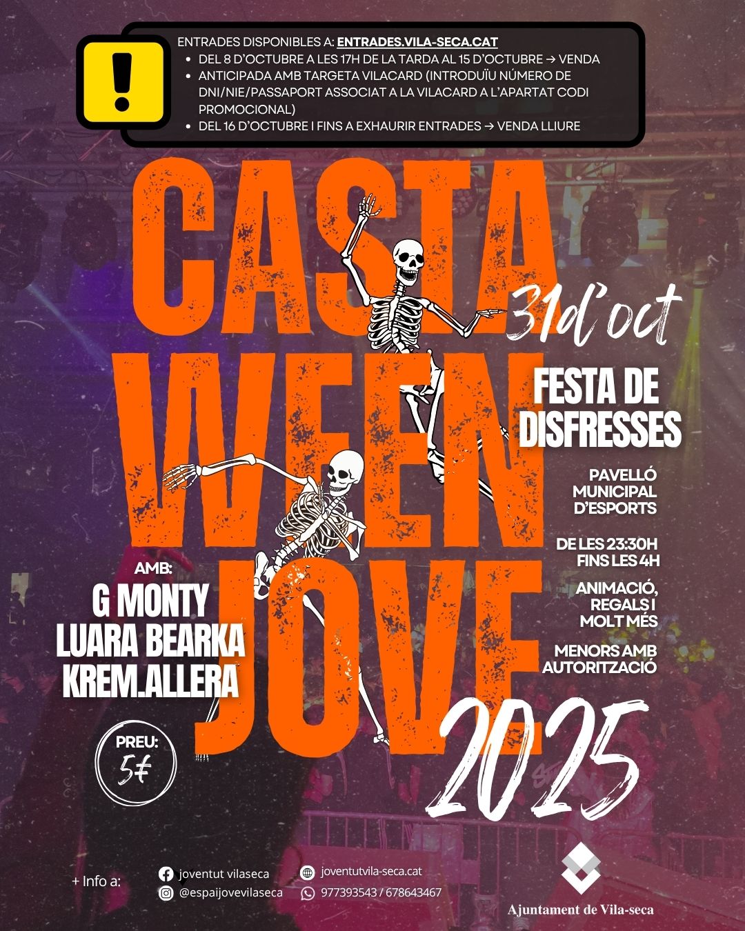 El proper 31 d'octubre torna la Castaween Jove, una festa de disfresses, que tindrà lloc al Pavelló Municipal d'Esports a Vila-seca a partir de les 23.30 h.